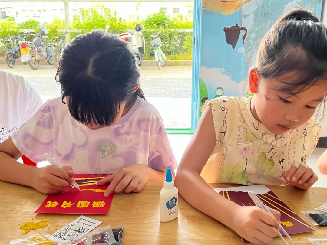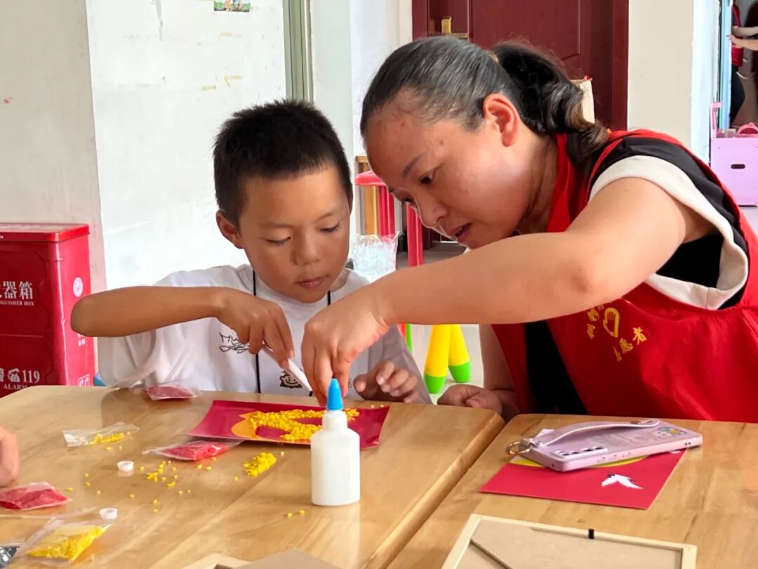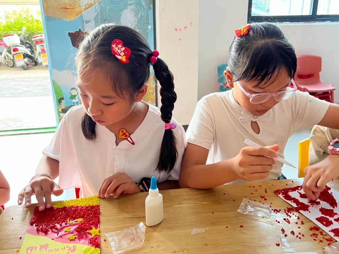 最受孩子们喜欢的 “粮食粘贴画” 环节,孩子们专注投入地制作着,遇到胶水涂太多的情况,也会互相分享 “少涂一点更易粘牢” 的小经验。
