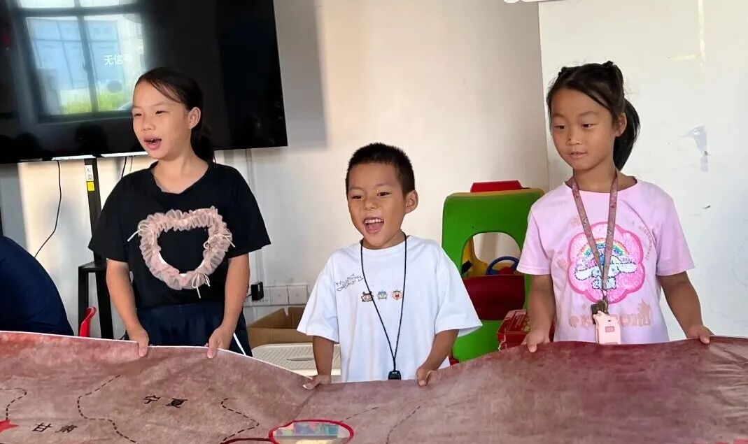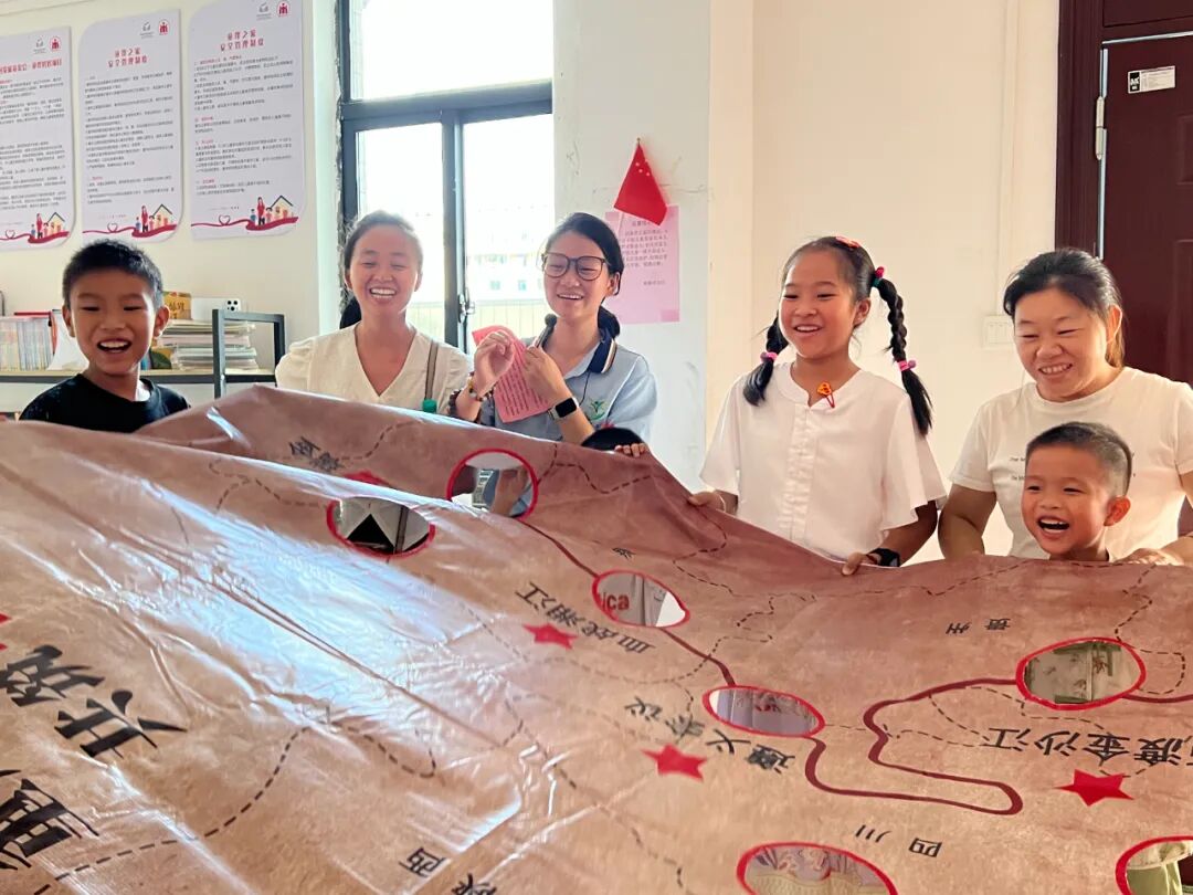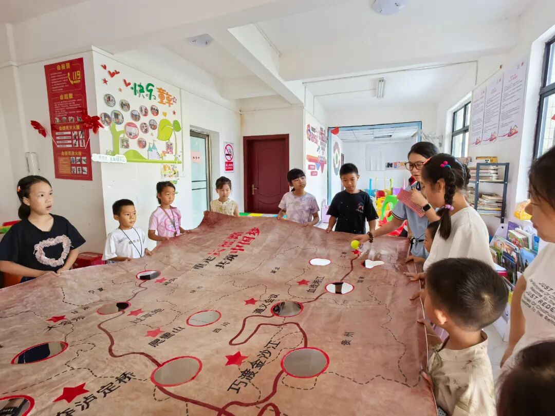 “重走长征路” 环节考验团队协作,孩子们每人拉住布的边缘,小心托着小球向 “延安” 前进。“慢一点!”“左边调低些!” 孩子们自发互相提醒,眼神紧紧盯着小球。最终小球成功抵达终点时,孩子们蹦跳着欢呼,笑容格外灿烂。