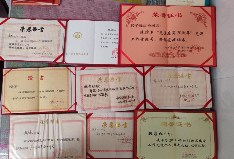2003年,58岁的应松退休了。收拾办公室时,望着满柜的账本以及“优秀党员”“先进工作者”等十来份荣誉证书,他不禁鼻头一酸。仅仅过了两个月,乡里因“无人管账”返聘他。他想着“家里没啥事”,便答应了下来。这一干,就干到了2022年,此时他已76岁,实在力不从心,才正式退下。在退休欢送会上,他说道:“我没什么本事,就认准一个‘实’字——干活踏实,做人老实。”