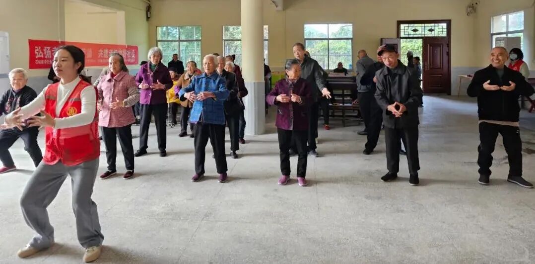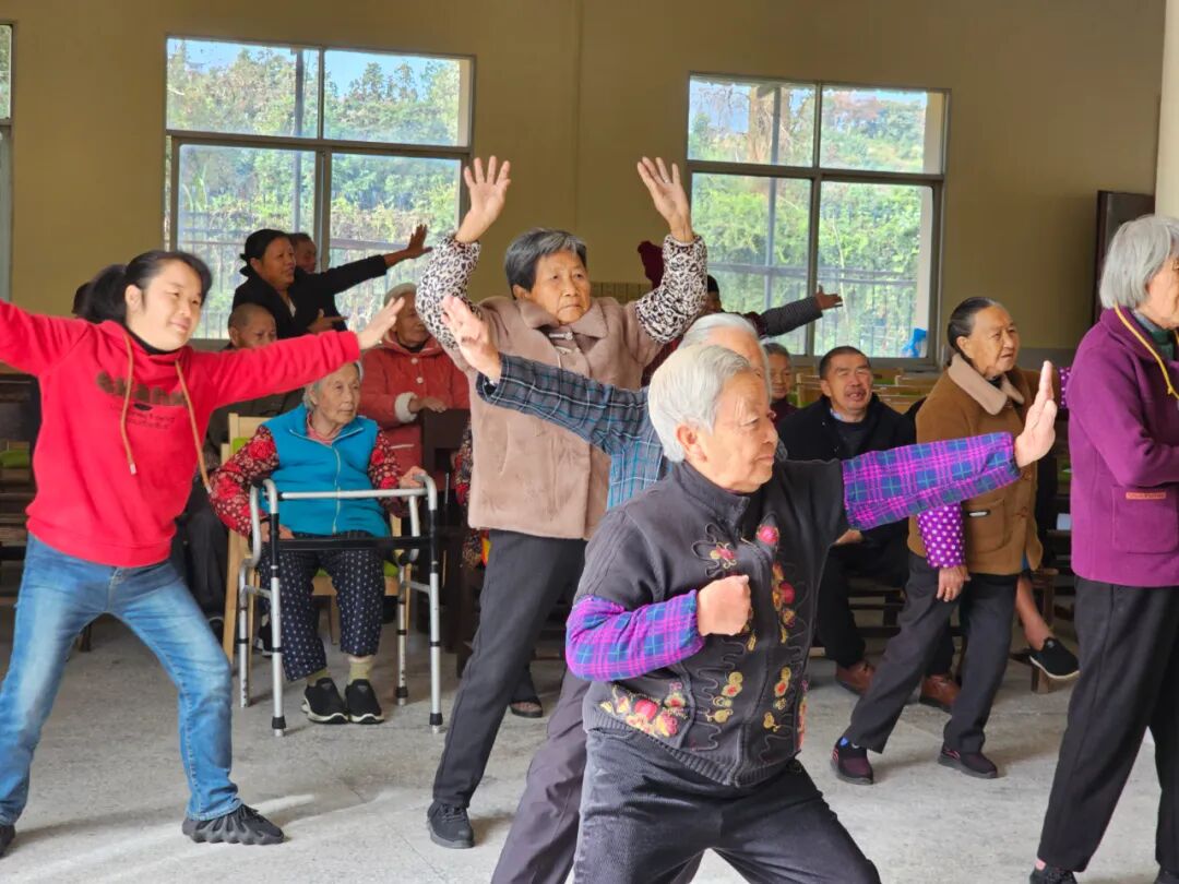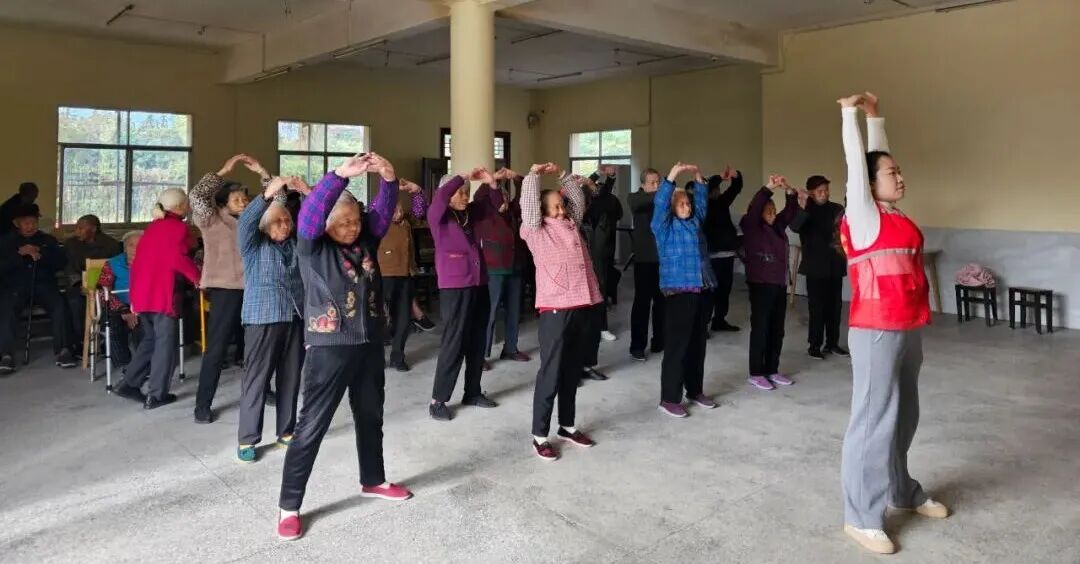 活动伊始,社工带领老人们练习养生功法八段锦。老人们精神抖擞地站好队形,跟着视频和社工的示范认真模仿,尽管部分动作尚显生疏,但大家热情高涨,一丝不苟,展现出积极乐观的精神风貌。