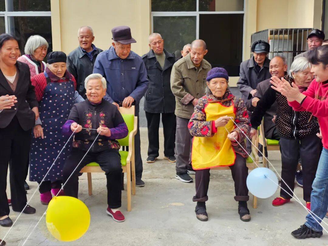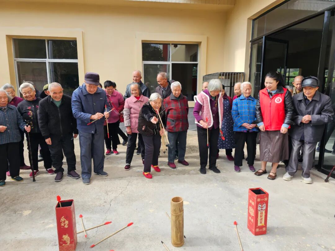 趣味游戏环节更是将活动气氛推向高潮。“百发百中投壶”游戏中,老人们各显身手。李爷爷姿势标准却屡试不中,引得众人善意欢笑;而90岁高龄、步履蹒跚的邓奶奶却凭借精准投掷,赢得阵阵喝彩。“传送气球”比赛中,老人们两人一组,手牵气球绳默契配合,在社工的口令下奋勇争先,现场欢声笑语不断。“趣味拧瓶盖”游戏考验着老人们的手部协调能力,大家全神贯注,在规定时间内比拼速度,充分享受着游戏带来的乐趣。