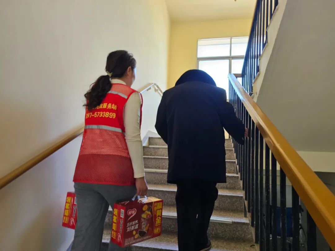 发放完毕,老人们拎着物资陆续返回房间,90多岁的姚爷爷正费力地帮86岁的妻子拎着八宝粥准备返回宿舍,社工和志愿者们立即上前主动帮忙拎物资、搀扶行动不便的老人,将老人们安全送回房间。