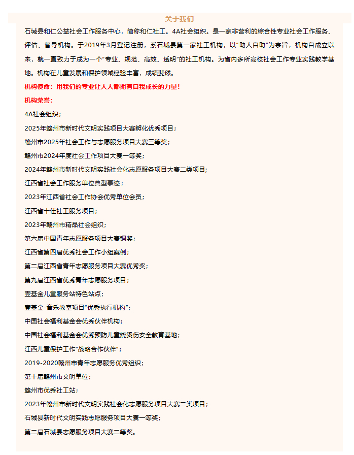 本项目所筹善款将用于江西省石城县壹基金儿童服务站“小手牵银发”项目铜锣湾社区站点的运营与服务。款项将用于提供安全的活动空间、丰富的成长课程,为长者们打造温暖的社交平台与贴心的关怀服务。我们通过代际融合活动,让老人与孩子在互动中建立情感联结,使孩子在长辈的陪伴下快乐成长,也让老人在孩子的笑语中感受温暖。