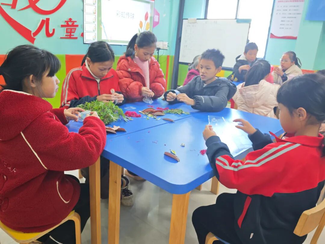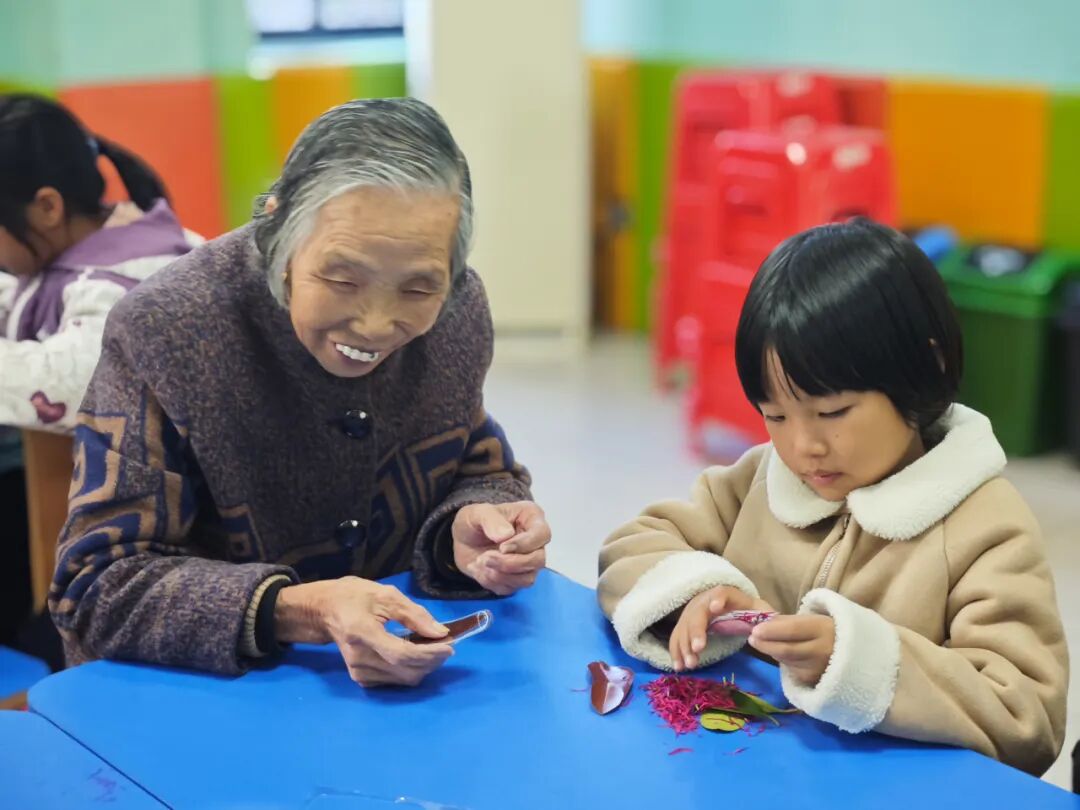 在制作书签环节,孩子们拿出自己早上细心挑选的植物叶片和花朵,两代人围坐一起,将自然之美融入手工创作中。老人们耐心指导,孩子们创意无限,一枚枚独一无二、充满自然气息的书签在他们的巧手下诞生。