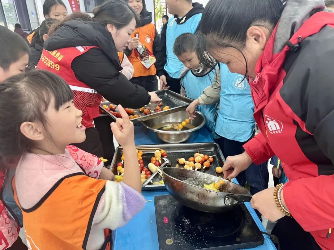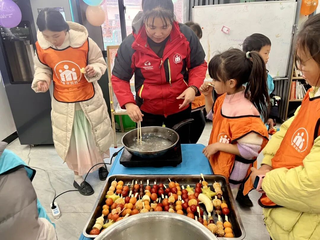 熬糖是制作关键,社工现场示范熬制技巧,精准把控火候与糖浆状态,指导孩子们为水果串均匀裹糖。这次采用冷水冷却妙招,裹糖后的糖葫芦经冷水冷却,成品酸甜酥脆,让孩子们惊喜不已。