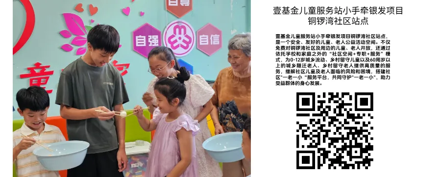 壹基金儿童服务站小手牵银发项目铜锣湾社区站点,是一个安全、友好的儿童、老人公益活动空间。不仅免费对铜锣湾社区及周边的儿童、老人开放,还通过依托学校和家庭之外的“社区空间+专职+服务”模式,为0-12岁城乡流动、乡村留守儿童以及60周岁以上的城乡随迁老人、乡村留守老人提供高质量的服务,缓解社区儿童及老人面临的风险和困境,搭建社区“一老一小”服务平台,共同守护“一老一小”,助力受益群体的身心发展。由于资源有限,我们需要更多来自社会爱心人士的支持和帮助。在此,壹基金儿童服务站小手牵银发项目铜锣湾社区站点诚邀您加入,共同助力壹基金儿童服务站小手牵银发项目铜锣湾社区站点这一服务平台的延续!