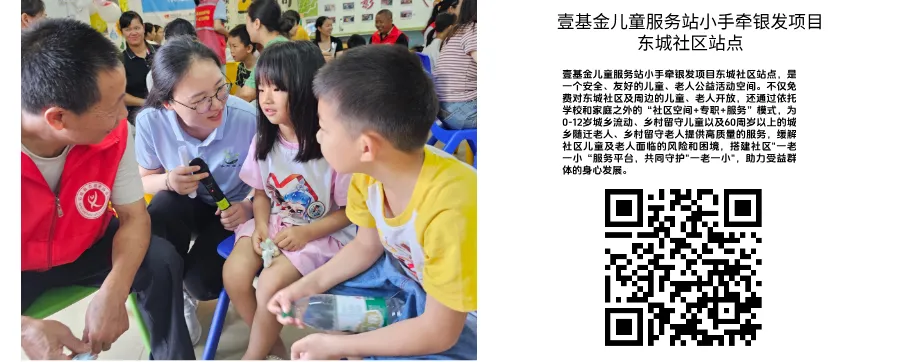 壹基金儿童服务站小手牵银发项目东城社区站点,是一个安全、友好的儿童、老人公益活动空间。不仅免费对东城社区及周边的儿童、老人开放,还通过依托学校和家庭之外的“社区空间+专职+服务”模式,为0-12岁城乡流动、乡村留守儿童以及60周岁以上的城乡随迁老人、乡村留守老人提供高质量的服务,缓解社区儿童及老人面临的风险和困境,搭建社区”一老一小“服务平台,共同守护”一老一小”,助力受益群体的身心发展。
