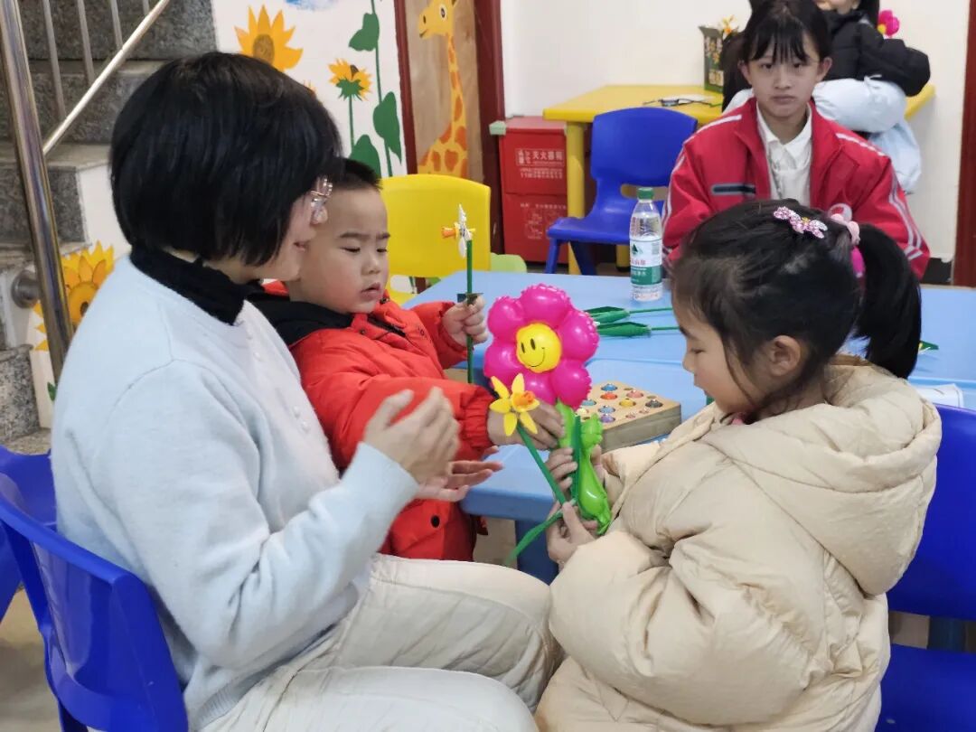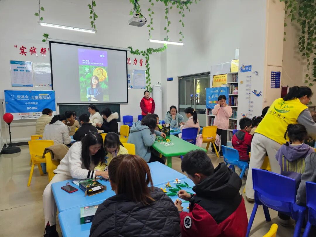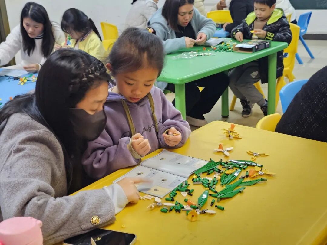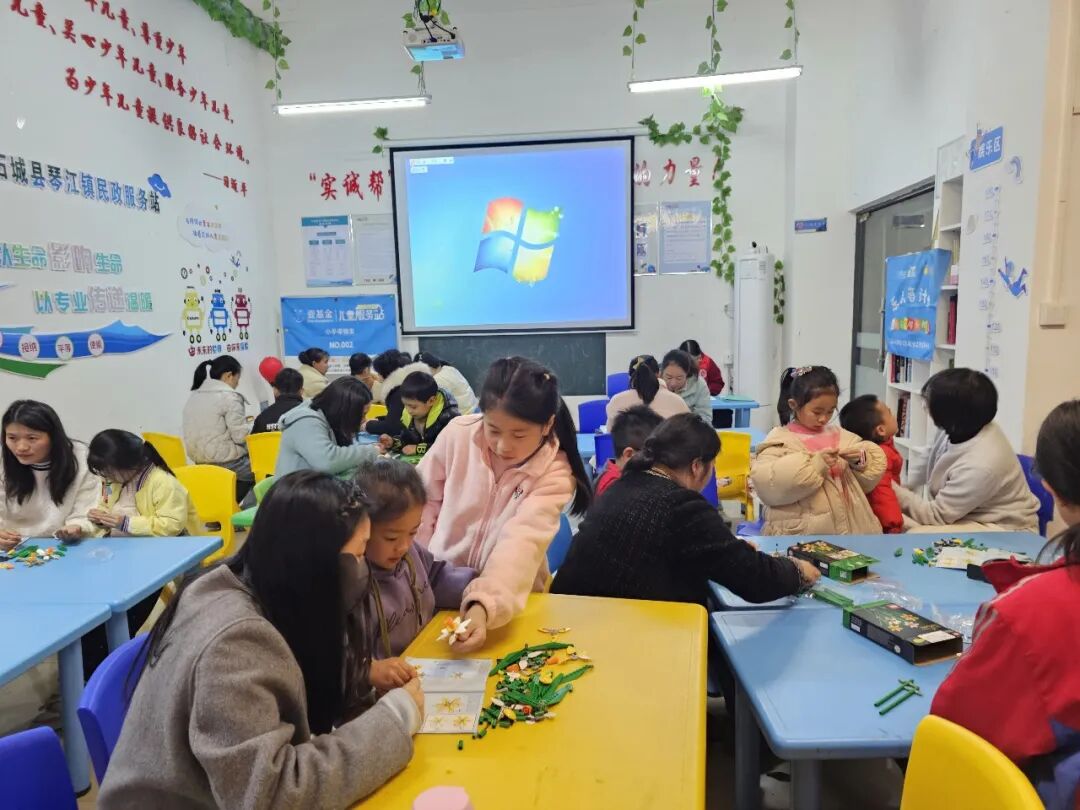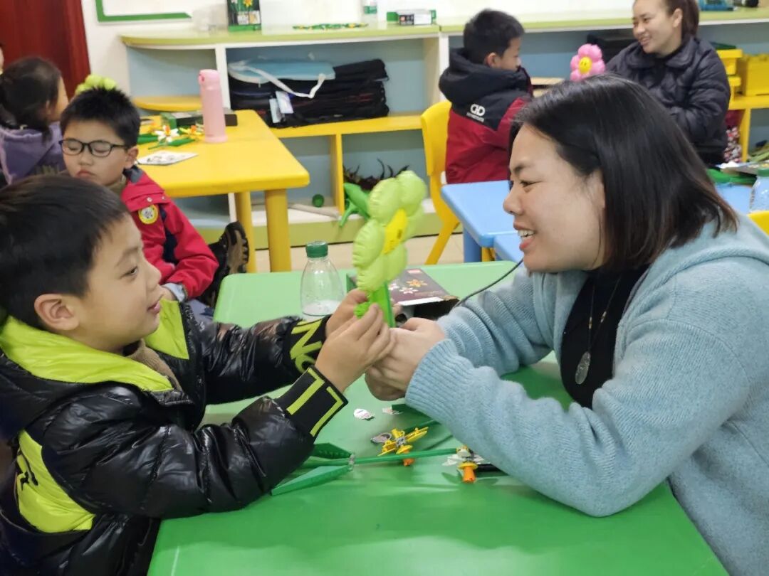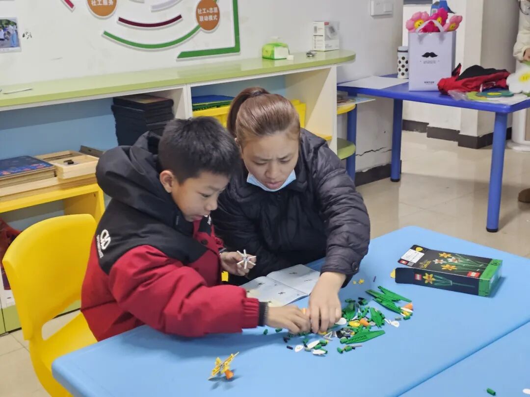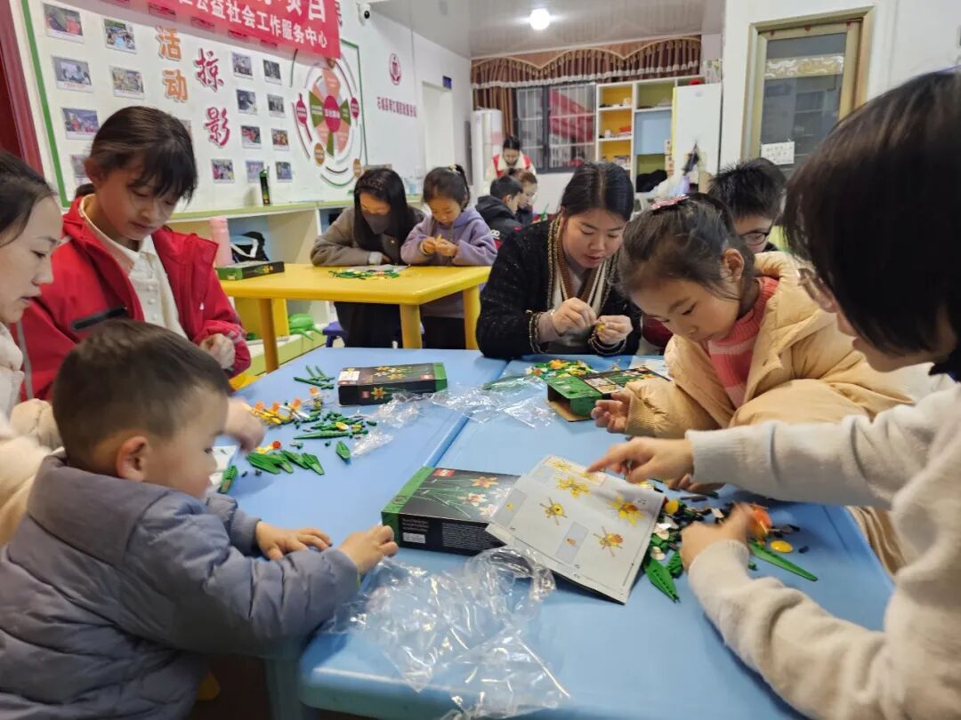 活动开始前,社工早已做好充分准备,为现场播放温馨的背景音乐,让到场的孩子与家长能够自由入座、轻松交流。家长和孩子们到场后,都领取到了精致的积木花,在家长的陪同下,孩子们认真拼接,一个个小巧可爱的积木花逐渐成型,提前为节日增添了几分童趣与暖意。