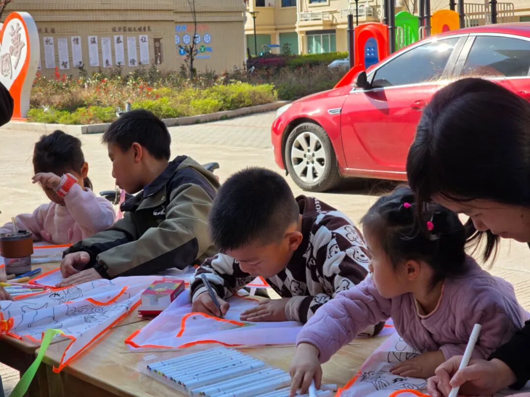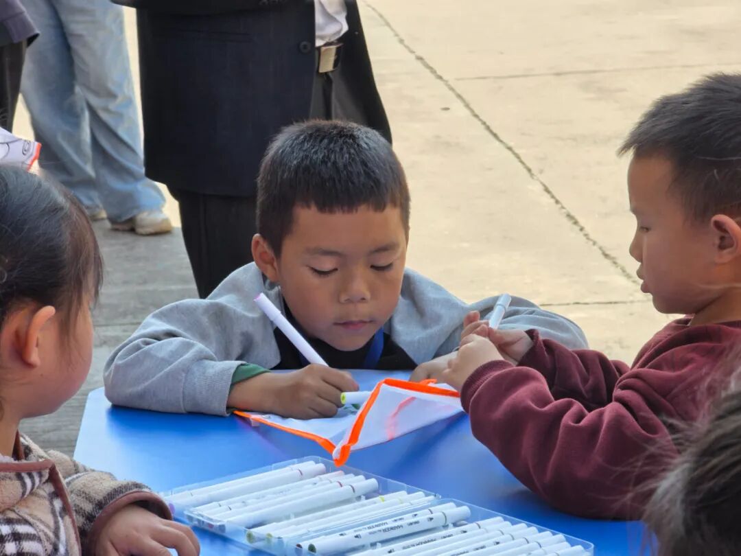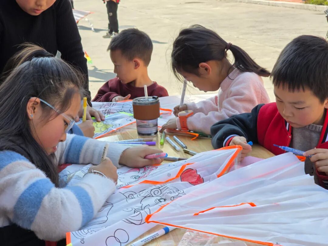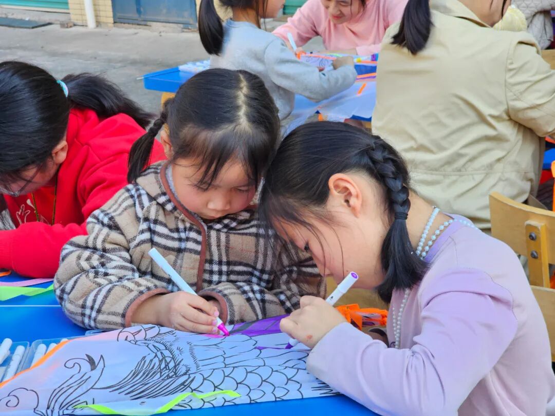 活动一开始,平时坐不住的小家伙们,瞬间变成了专注的“小画家”。一盒彩笔,一片空白的风筝布,就把春天画进了风筝里。