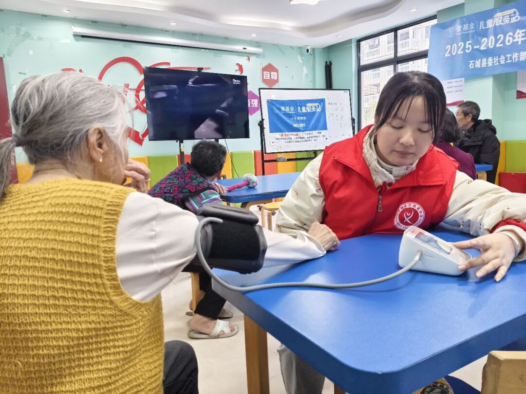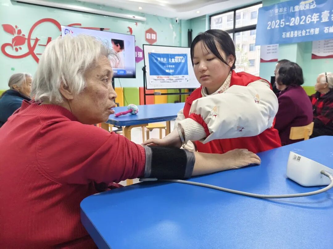 社工为老人逐一测量血压,耐心记录并叮嘱健康注意事项,送上第一份暖心关怀。