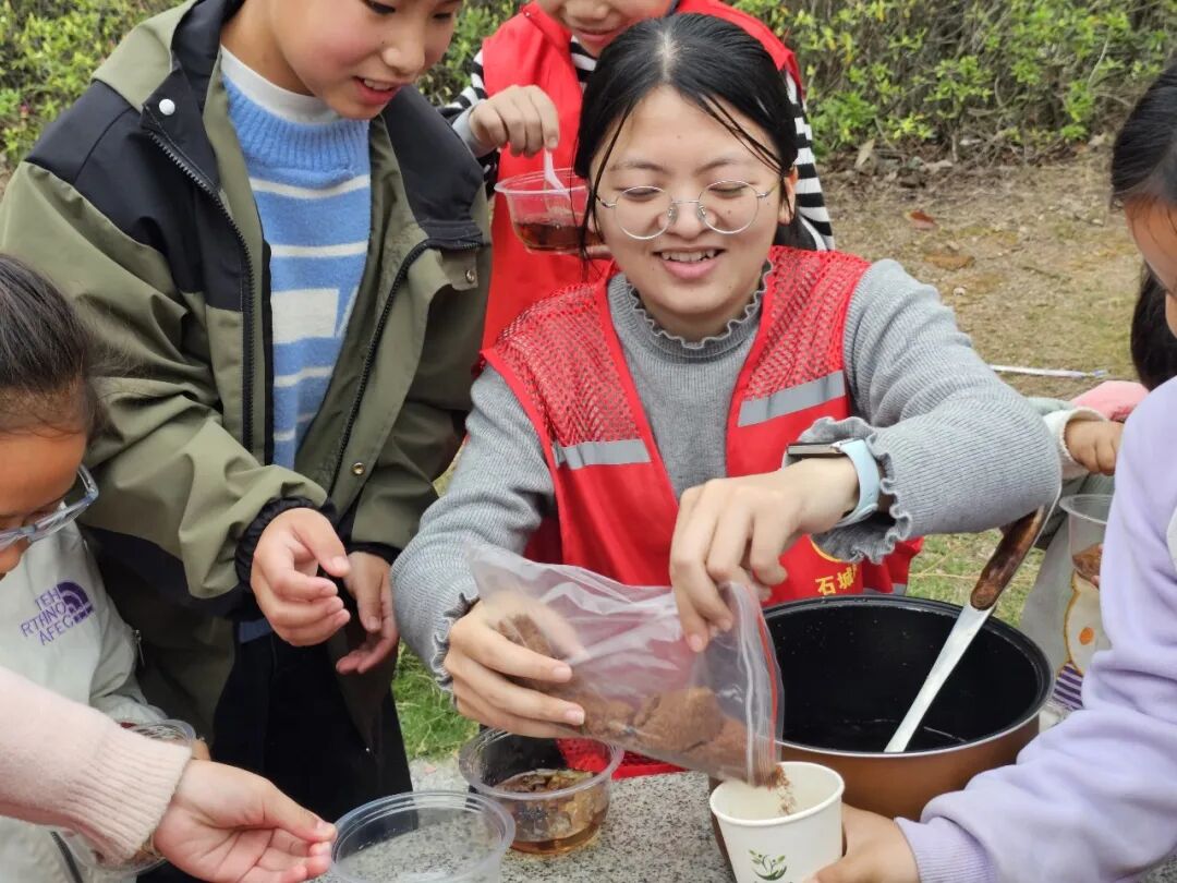 活动尾声,甜蜜的惊喜悄然登场。社工和志愿者们端出精心准备的凉粉,淋上红糖水。孩子们有的迫不及待地品尝起来,有的则小心翼翼地端着碗,送给广场上的其他居民。大家分享着同一份清凉与甜润,闲话着刚才的趣事。