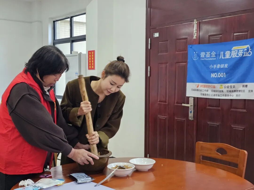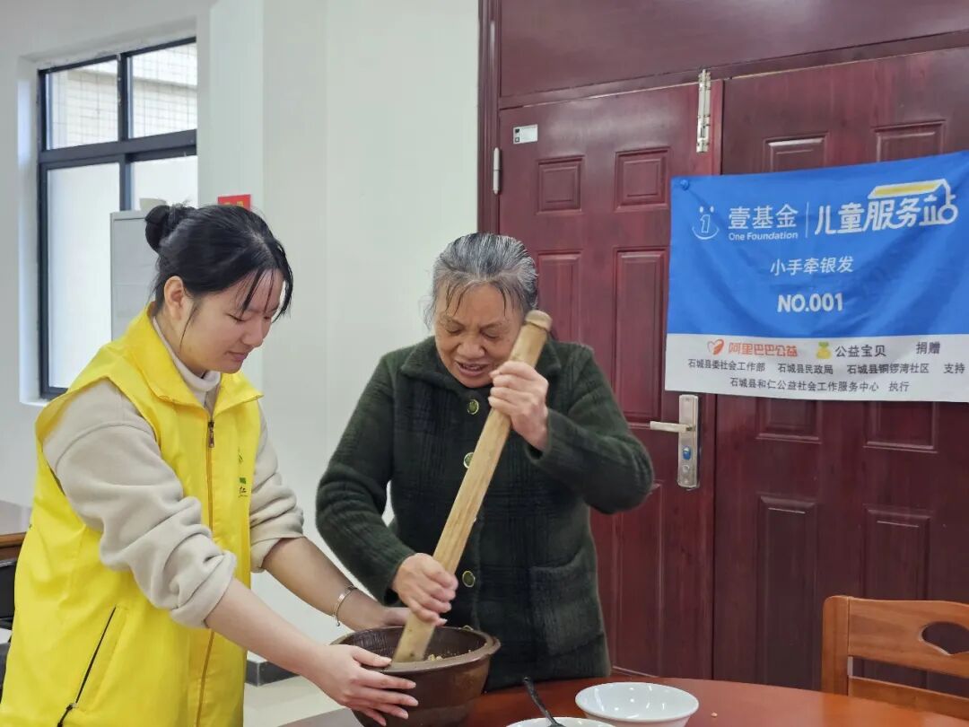 为了让青团的馅料更香更细腻,社工和老人一起,把芝麻和花生用擂钵捣碎、捣香。