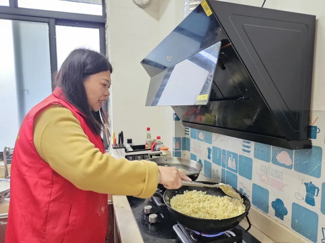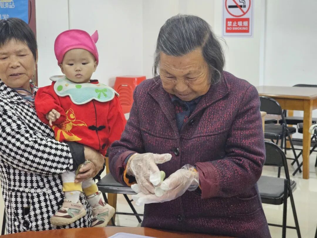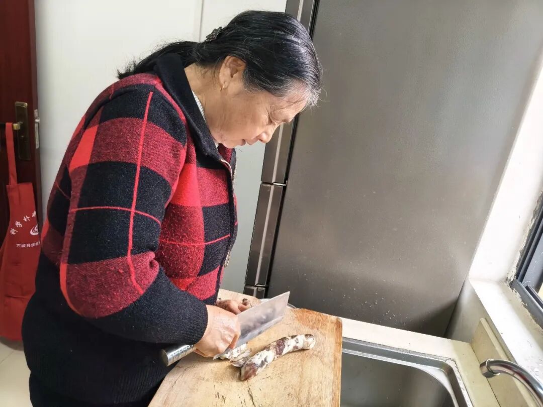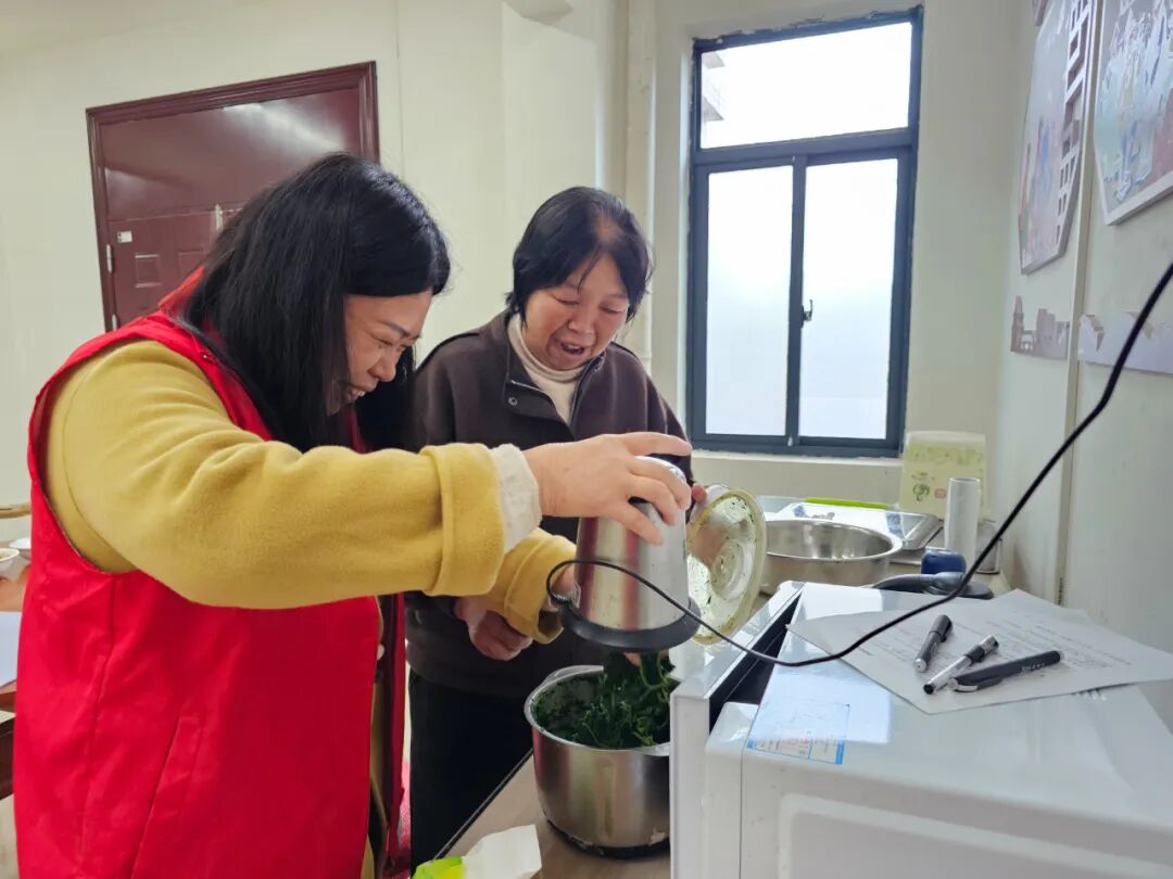 活动当天就有老人早早来到服务站,帮忙一起清洗艾草、烧水焯煮。郑奶奶一边切香肠一边笑着说:“这个我拿手!”还有老人主动帮忙炒馅,厨房里热气腾腾,笑声不断。