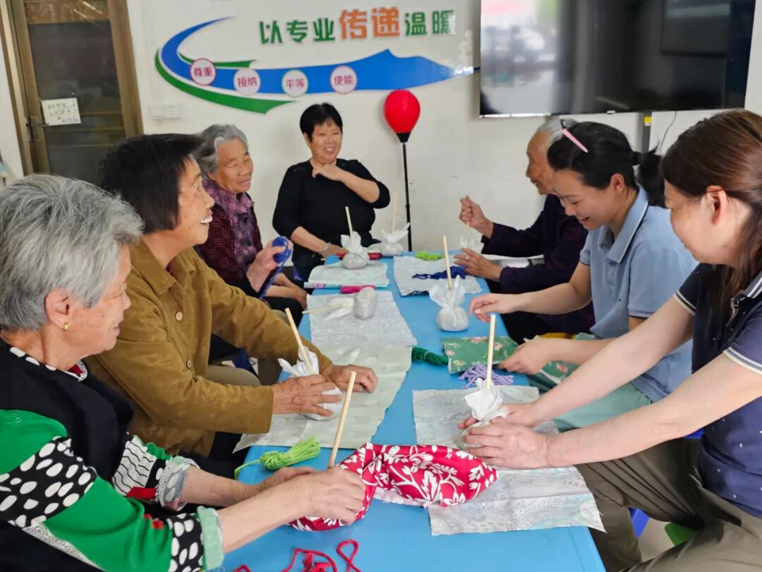 活动的高潮当属艾草养生锤手工制作环节。老人们兴致勃勃地动手操作,社工则穿梭其间,为动手能力稍弱的长者提供“搭把手”式的协助。“你看我这个锤子扎得紧不紧?”“这个艾草味道闻着真舒服!”老人们互相展示着自己的半成品,现场充满了成就感的欢笑。