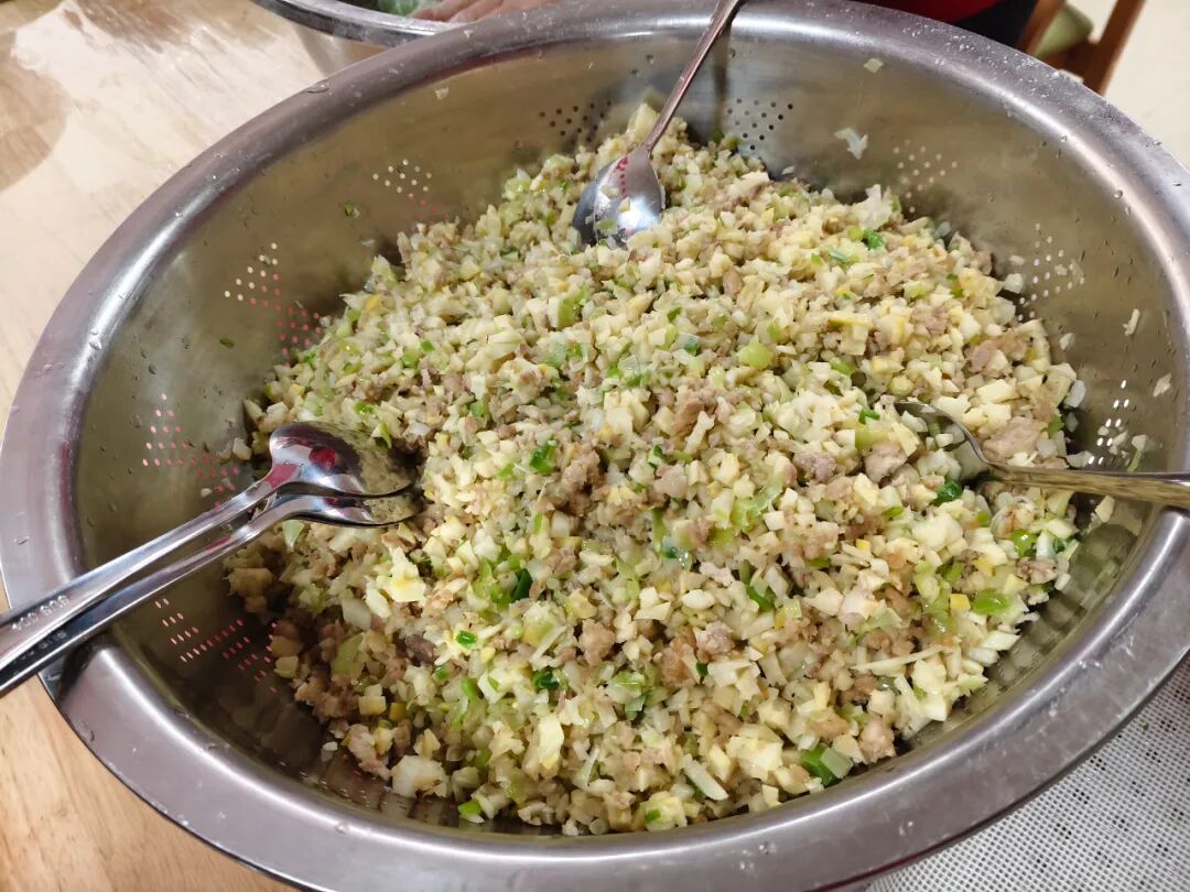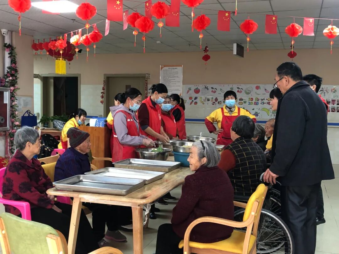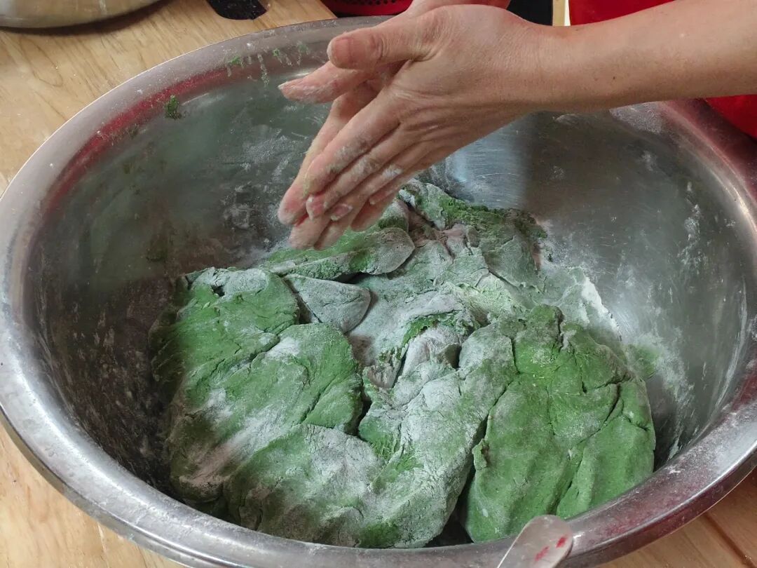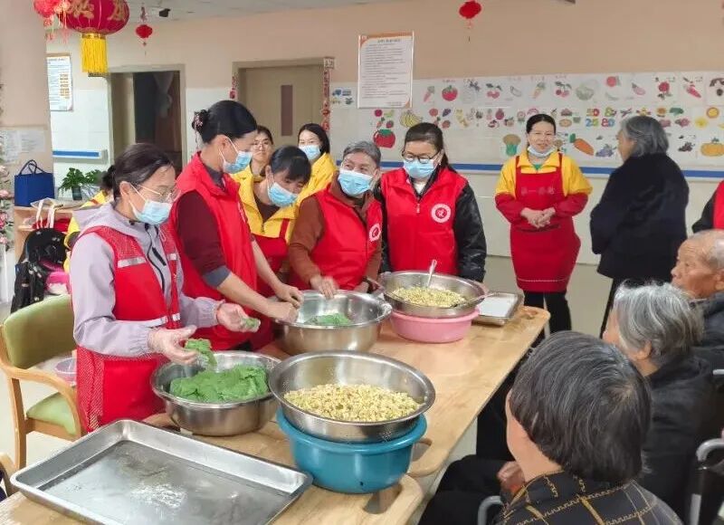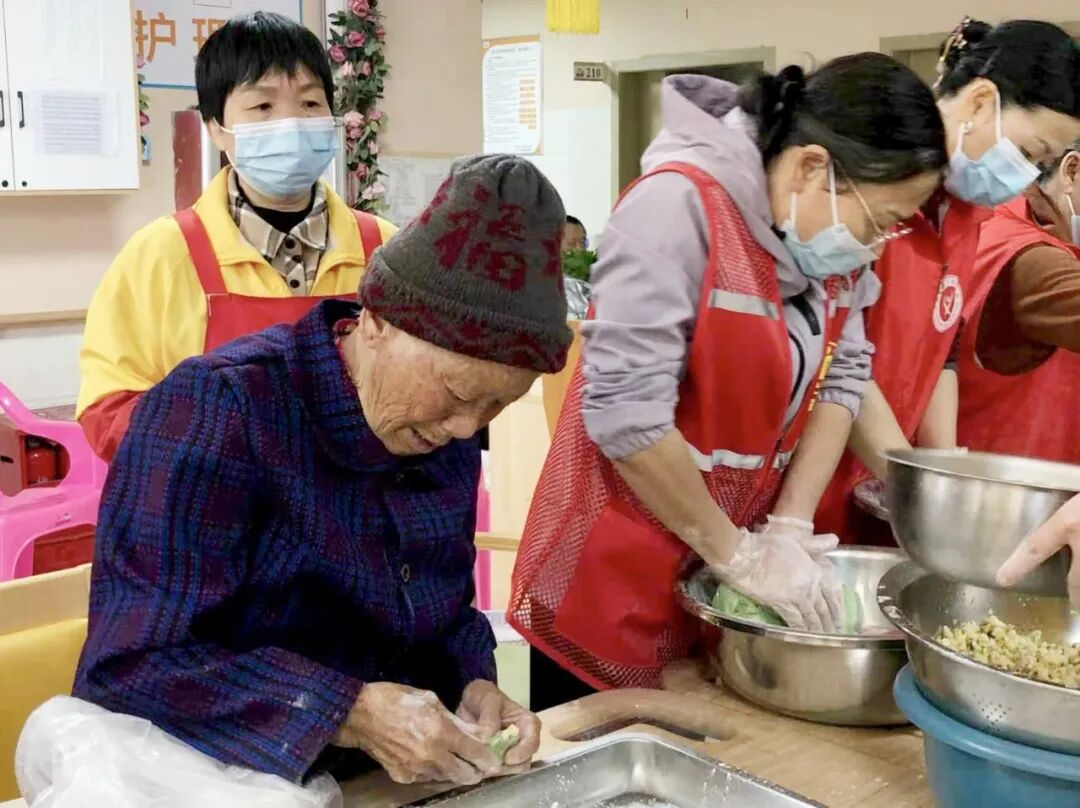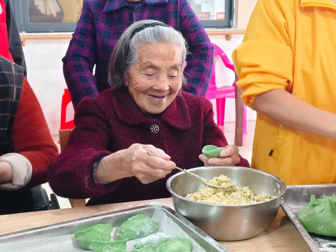 社工和志愿者抵达护理院时,工作人员早已精心备好清香软糯的青团皮和喷香扑鼻的馅料,这次的馅料是冬笋腊肉馅,地道的家乡味道。