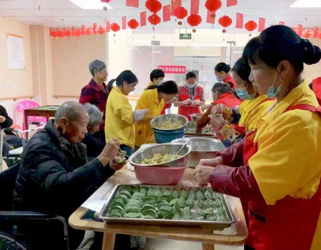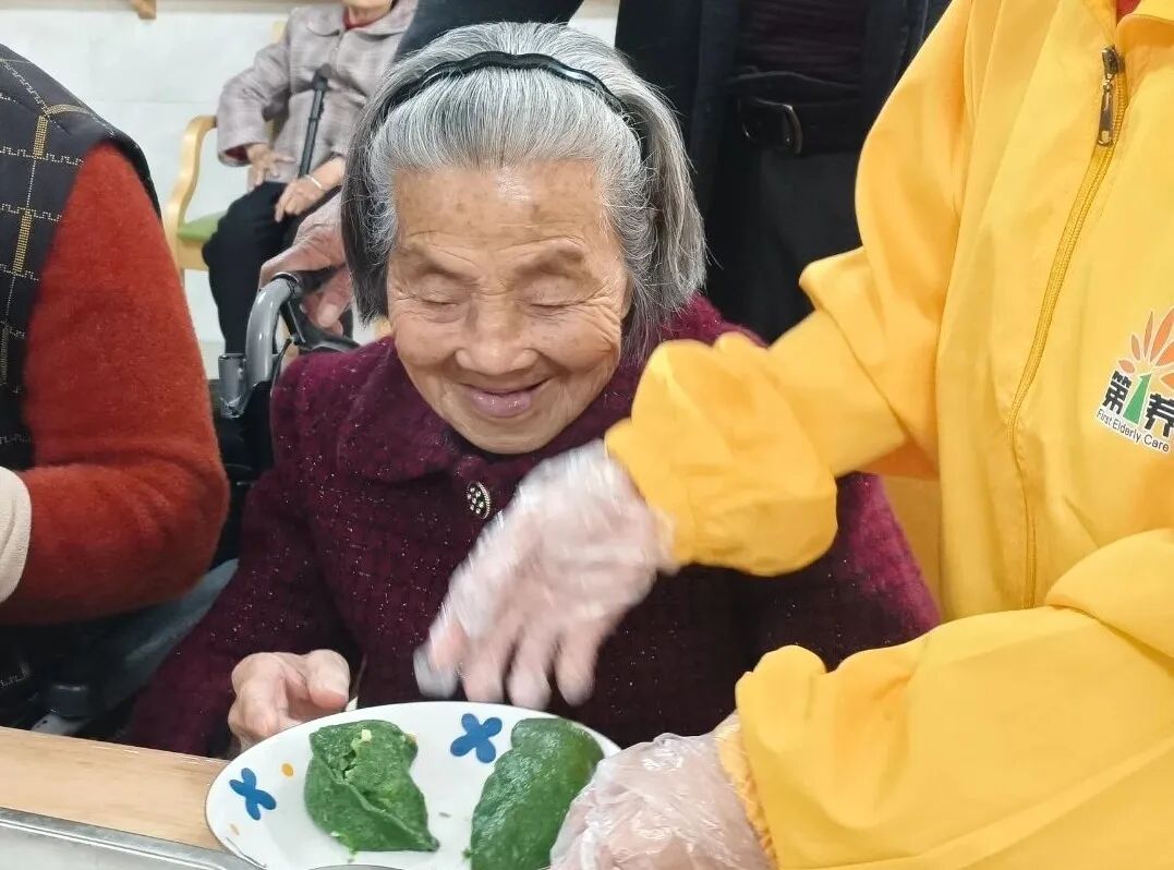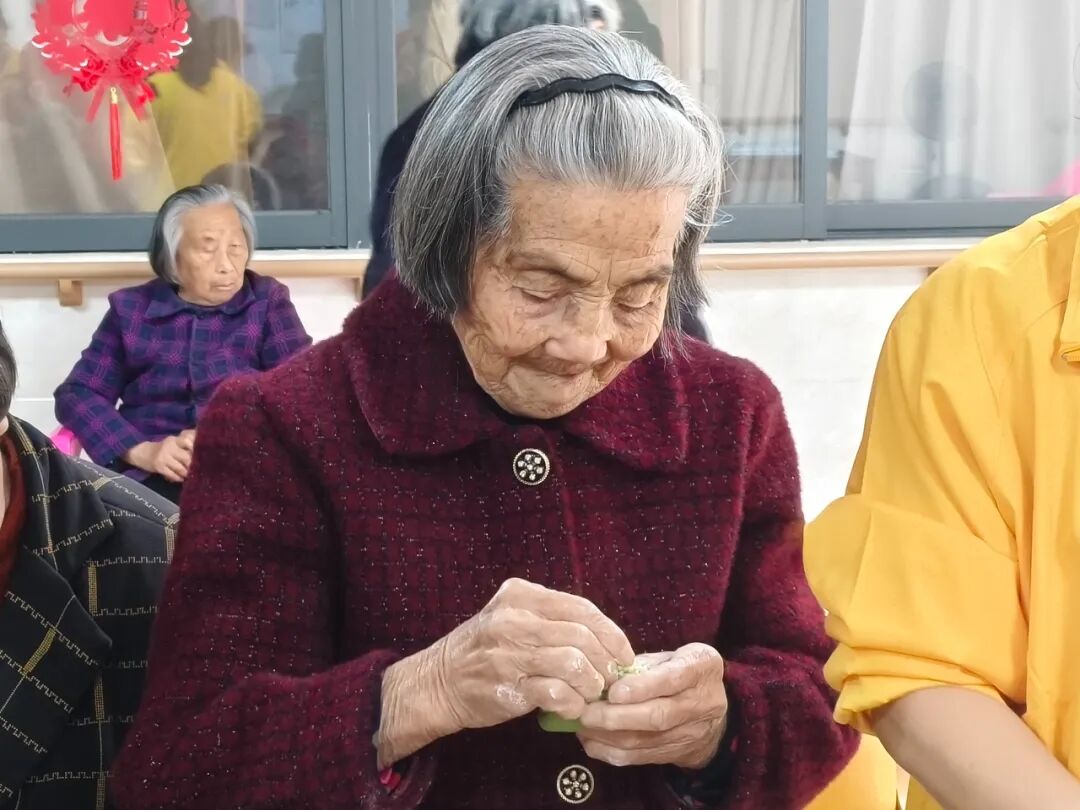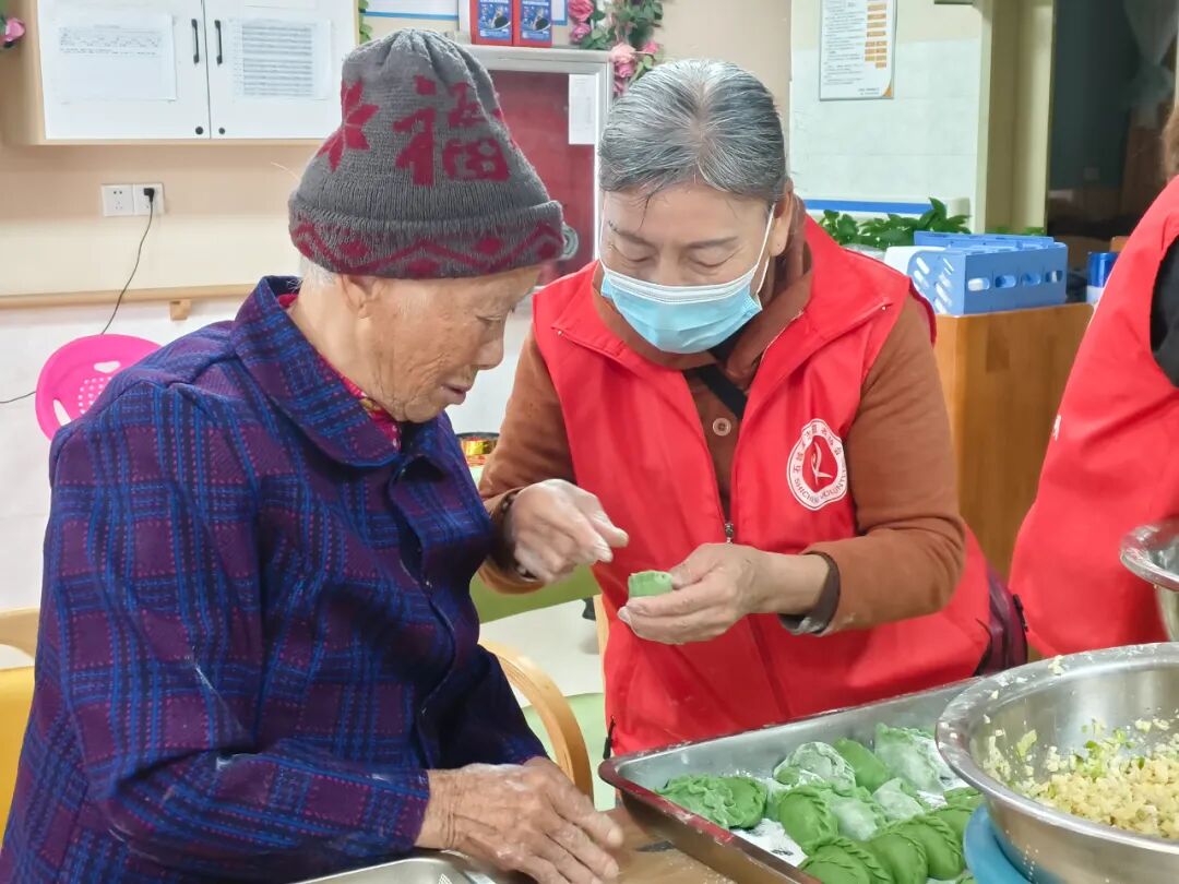 有的老人手部不太灵活,志愿者就先把青团皮揉圆放好,再扶着老人的手轻轻按压,挖好馅料递到老人手心,笑着说:“您试着把皮合起来,慢慢捏紧,像这样……”