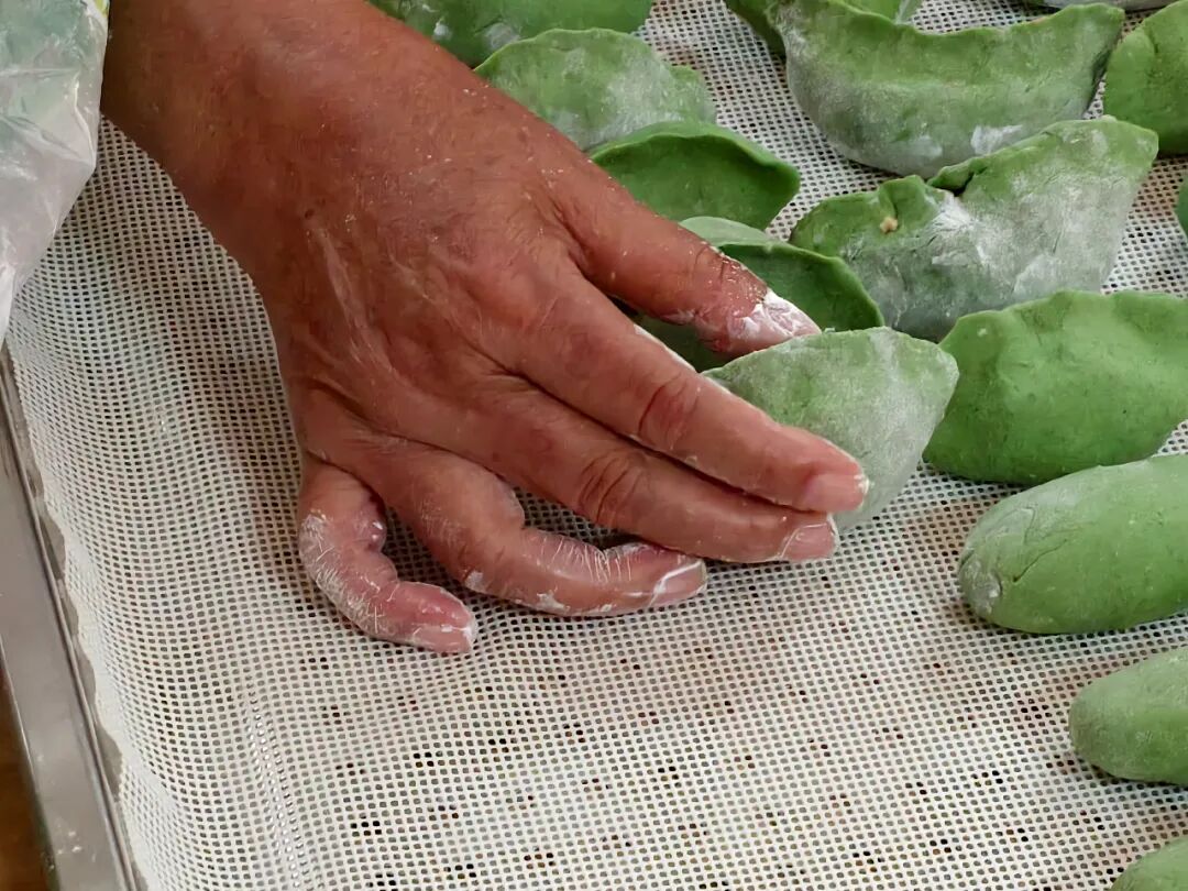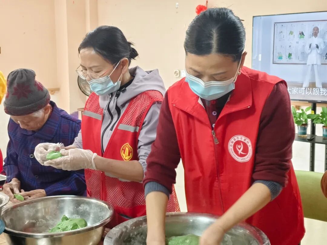 揉面、包馅、塑形,一个个圆润可爱的青团在手中成型,香气氤氲间,是长者们的欢声笑语,更是老年志愿者无私奉献的最美模样。其中,有一位老人因身体原因无法食用这些馅料,志愿者得知后,特意用青团皮为他搓了几个长条状的、只有皮没有馅料的青团。